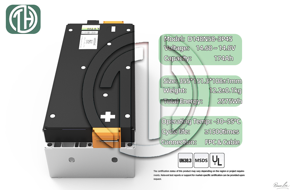 В последние годы 3Аккумуляторный модуль NMC P4S 58 Ач спроектирован в соответствии с ВДА 355 структурные стандарты, интеграция три параллельные цепочки из четырех призматических элементов NMC серии 58 Ач. При номинальном напряжении 14.8 V на строку и общую мощность 174ах, этот модуль обеспечивает высокая плотность энергии, надежная механическая прочность, и превосходная термическая стабильность.